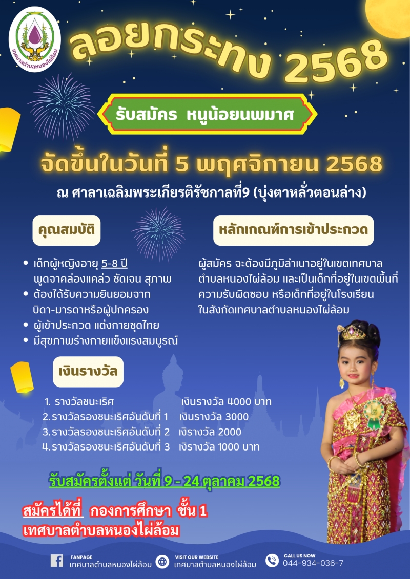 ✨ เทศบาลตำบลหนองไผ่ล้อม ขอเชิญน้อง ๆ หนู ๆ เข้าร่วม การประกวดหนูน้อยนพมาศ ประจำปี 2568 ✨...