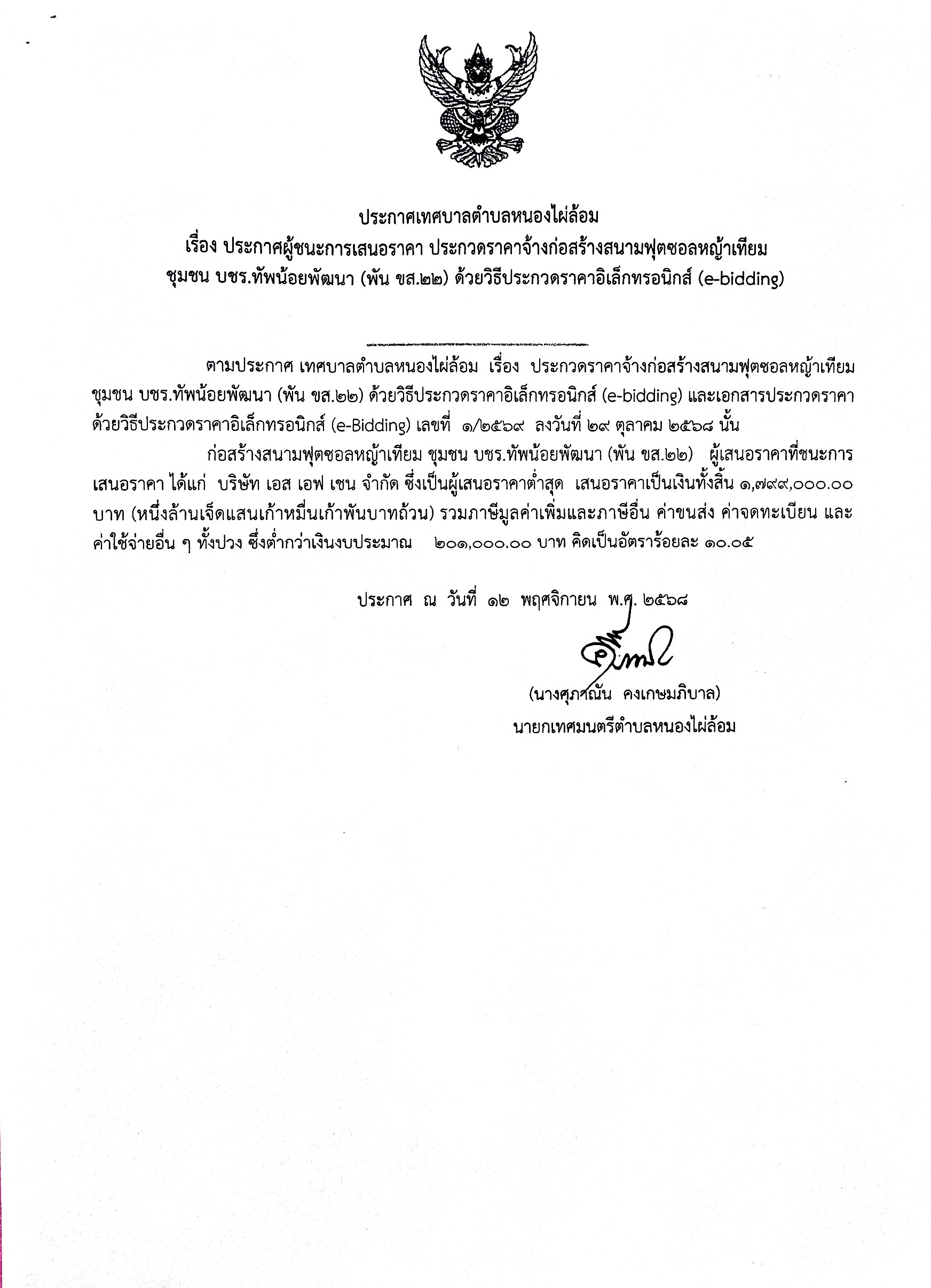 ประกาศเทศบาลตำบลหนองไผ่ล้อม เรื่อง ขยายเวลาการพิจารณาผลการประกวดราคาอิเล็กทรอนิกส์ ประกวดราคาโครุงการก่อสร้างอาคารอเนกประสงค์ ๒ ชั้น มีดาดฟ้า ด้วยวิธีประกวดราคาอิเล็กทรอนิกส์ (e-bidding |