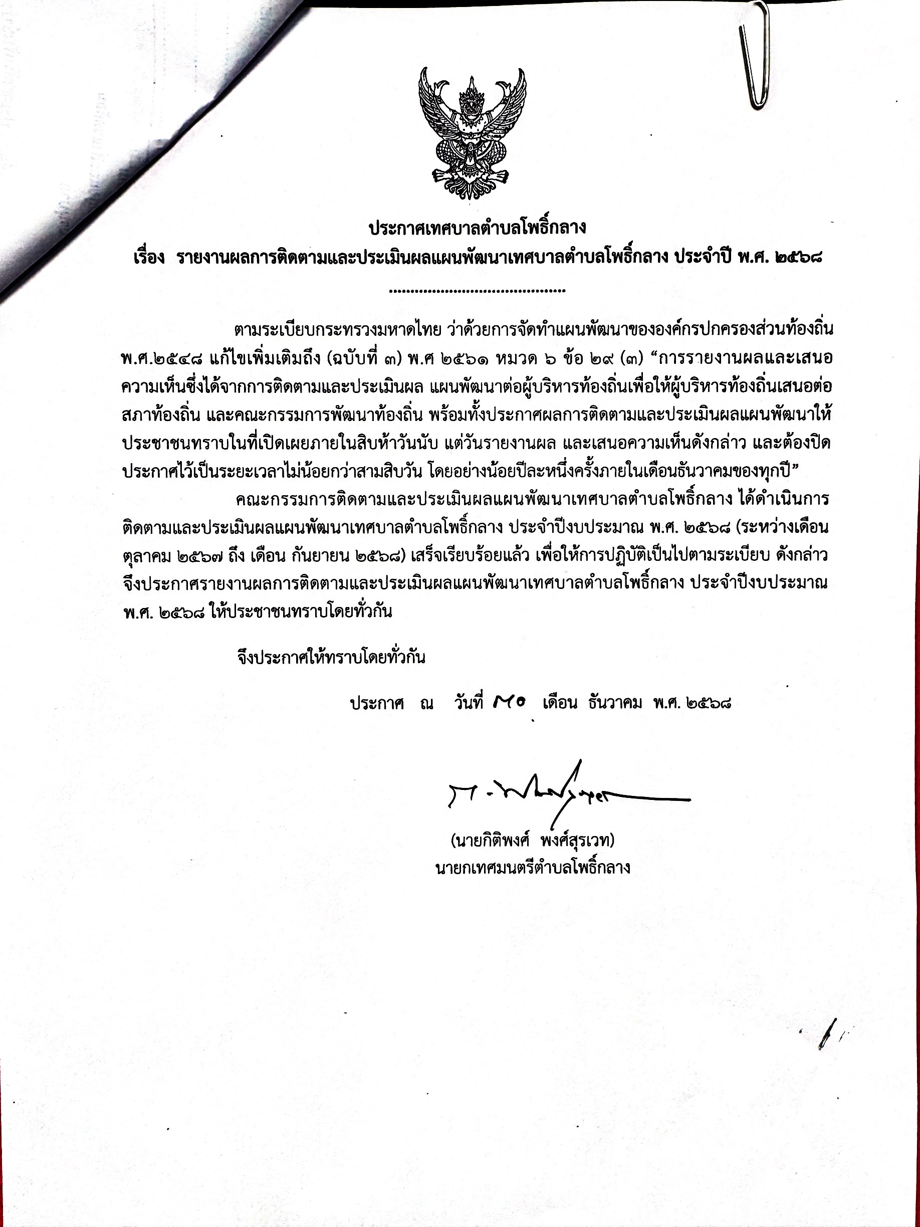 ประกาศเทศบาลตำบลโพธิ์กลาง เรื่องรายงานผลการติดตามและประเมินผลแผนพัฒนาเทศบาลตำบลโพธิ์กลาง ประจำปี 2568 |