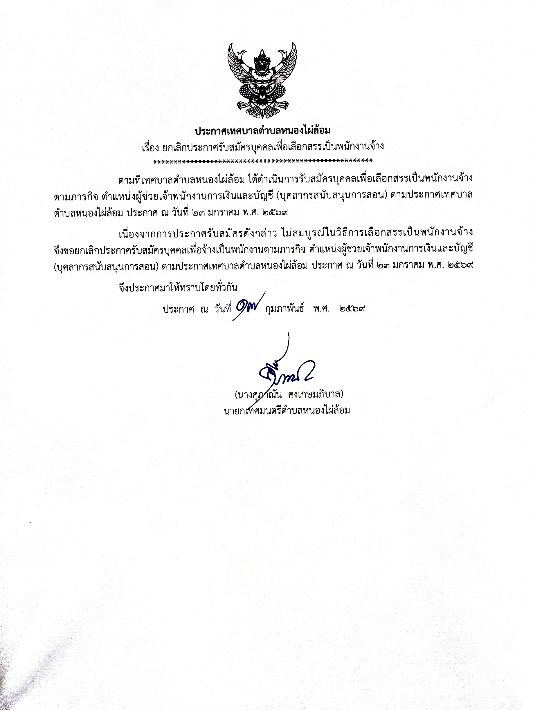 ประกาศเทศบาลตำบลหนองไผ่ล้อม เรื่อง ยกเลิกประกาศรับสมัครบุคคลเพื่้อเลือกสรรเป็นพนักงานจ้าง |