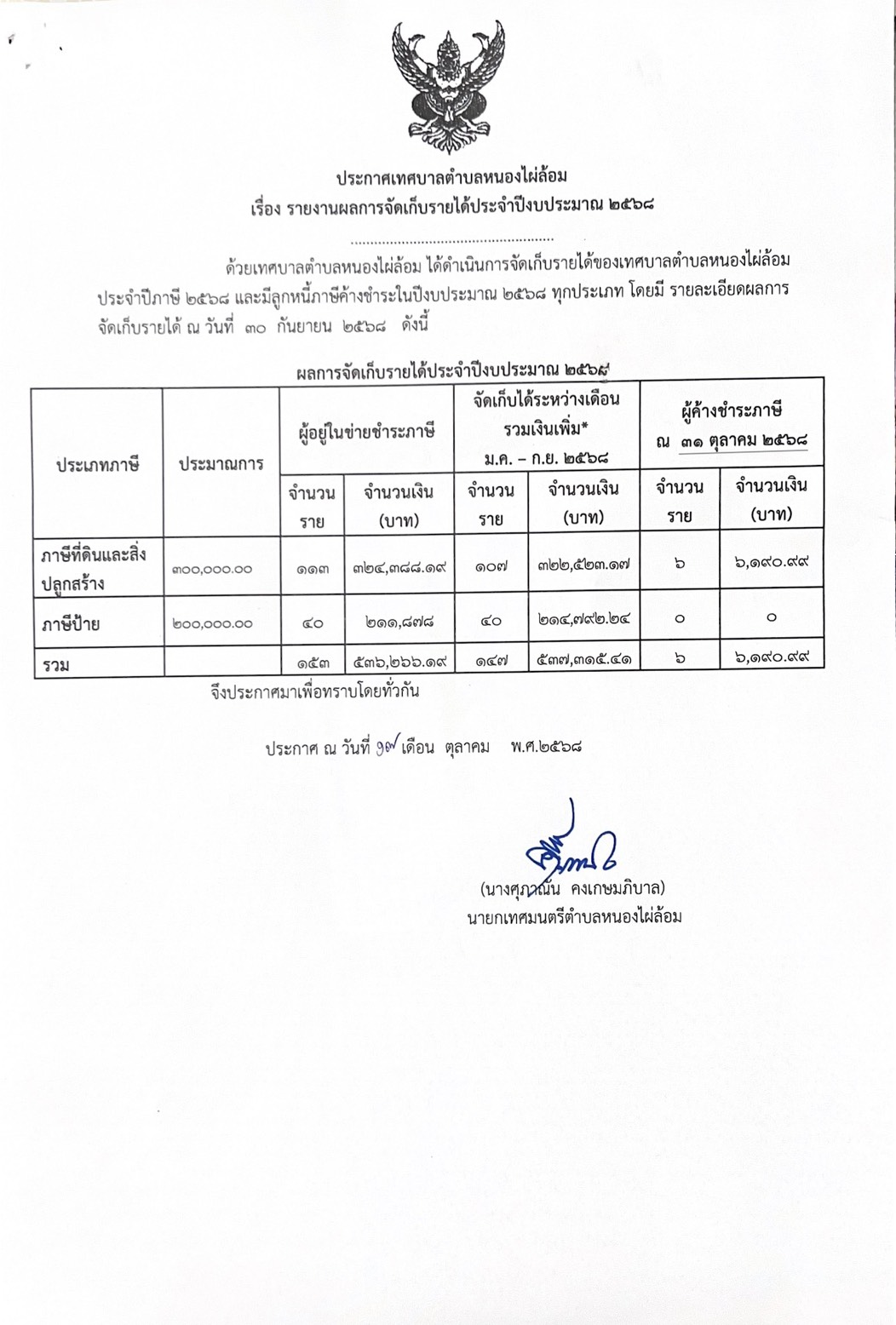 ประกาศเทศบาลตำบลหนองไผ่ล้อม เรื่อง รายงานผลการจัดเก็บรายได้ประจำปีงบประมาณ 2568 |